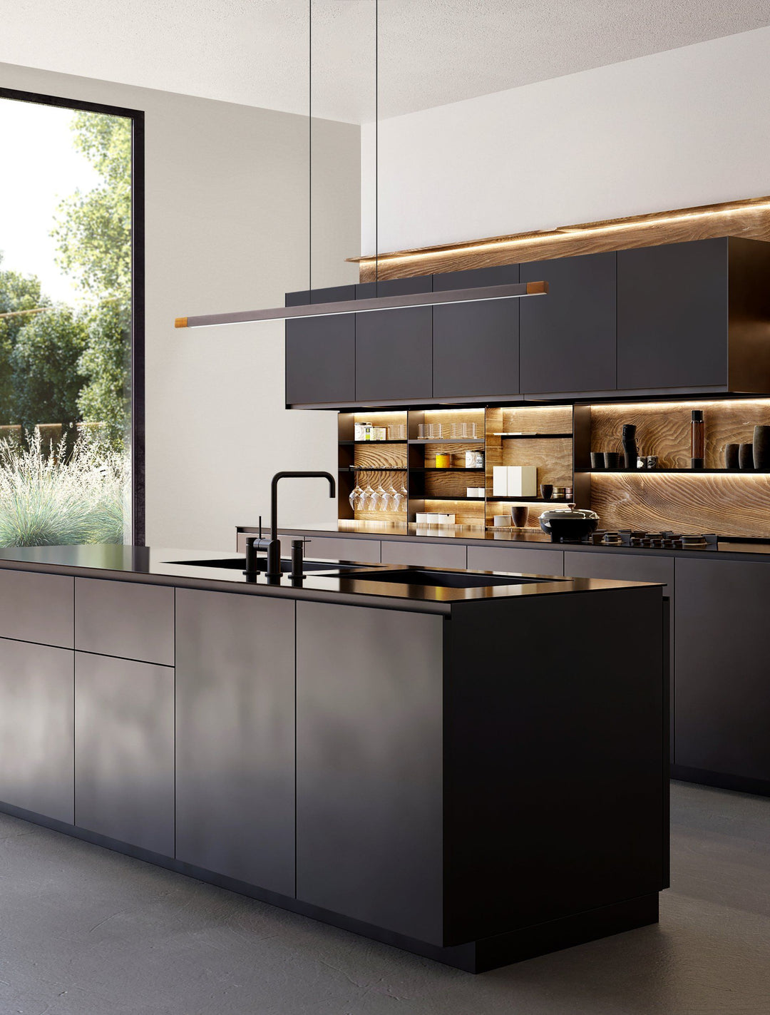 The LISCIANA pendant light features a suspended aluminium linear pendant, complete with a wooden walnut finish. This modern pendant is a great addition over dining tables or breakfast bars.