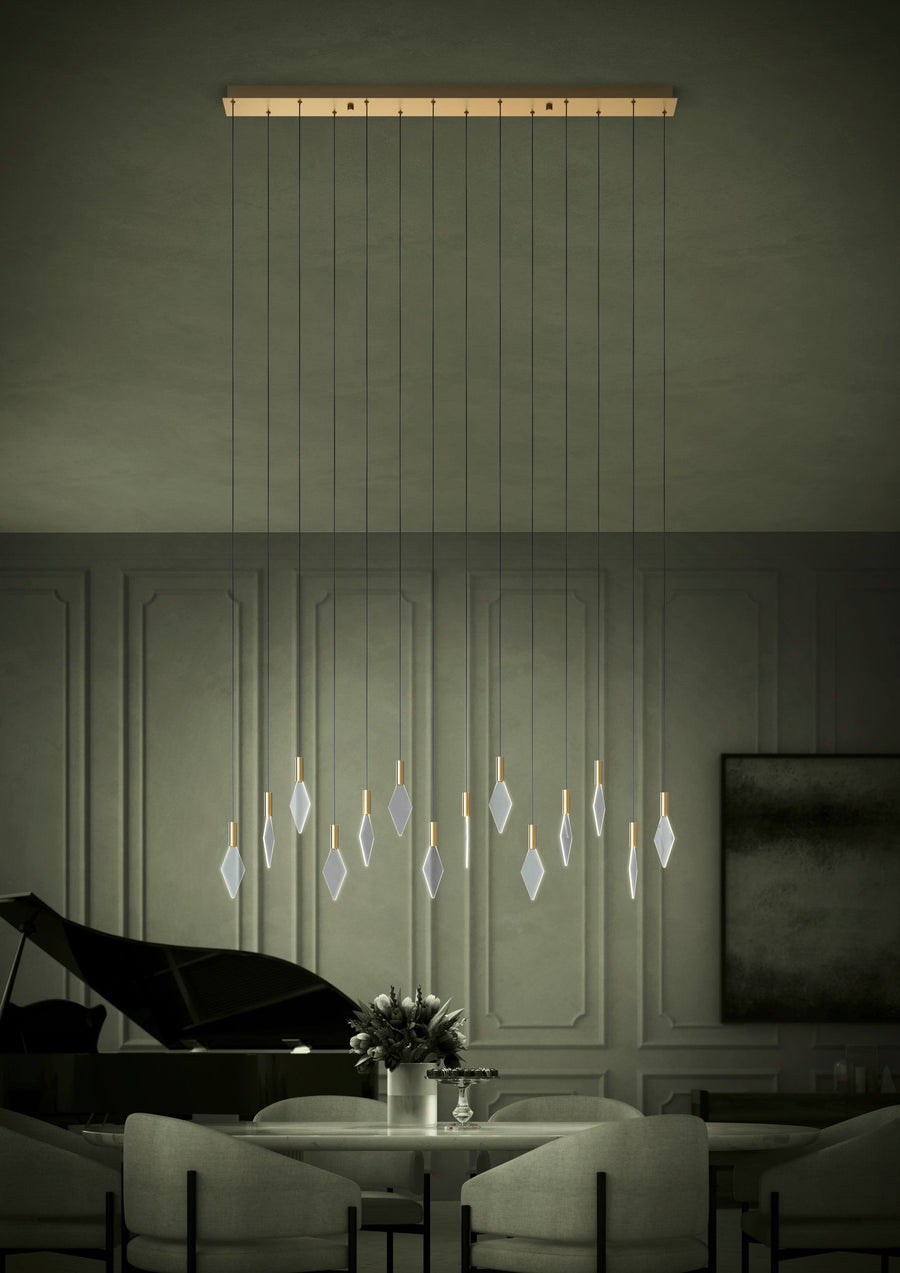 The MIRADOR LED pendant range is truly spectacular, featuring a stunning brass canopy adorned with suspended acrylic glass diamonds. The edges of the diamonds create a sparkling effect, adding a touch of elegance to any room.