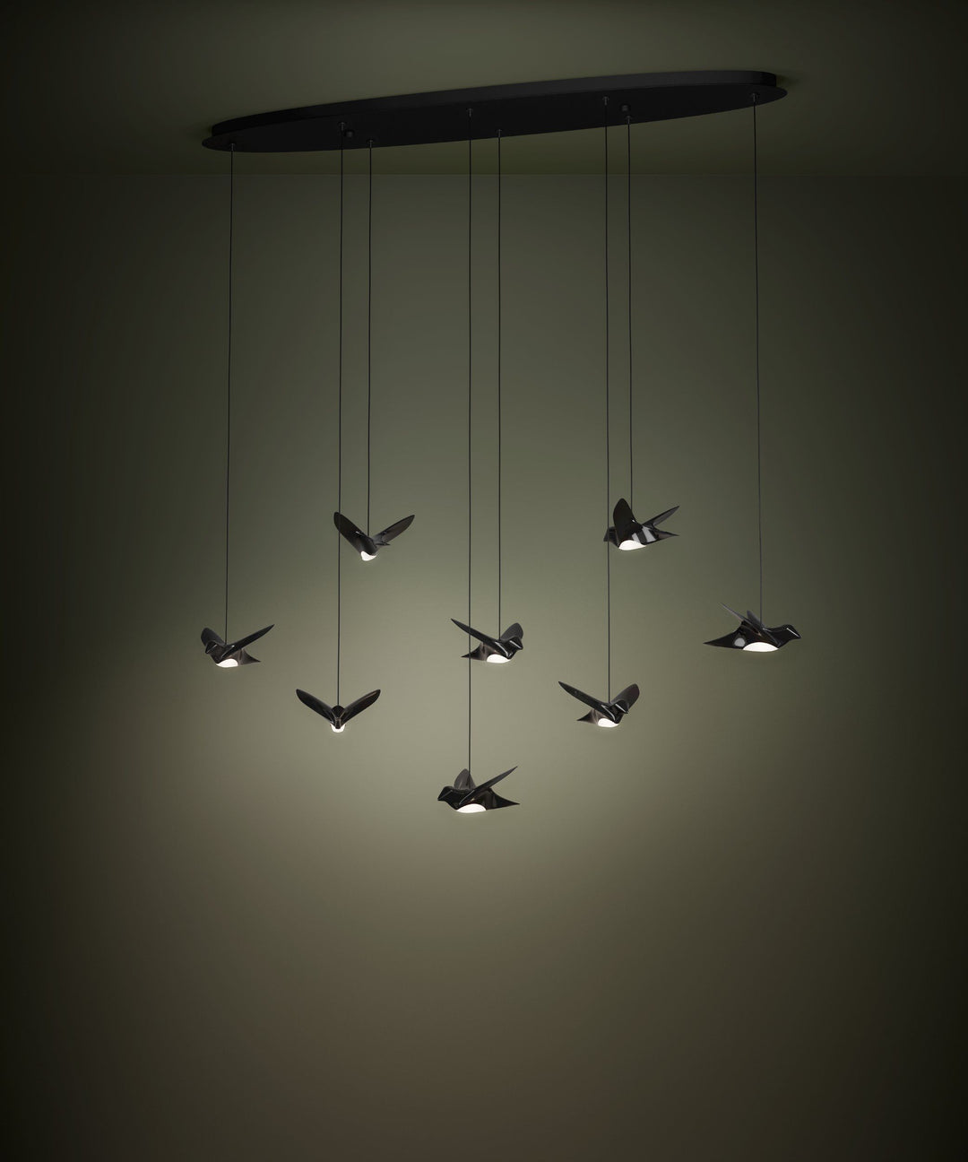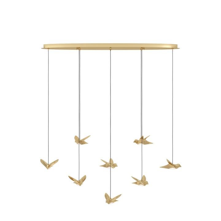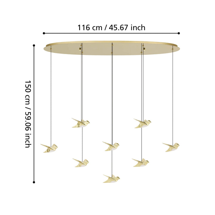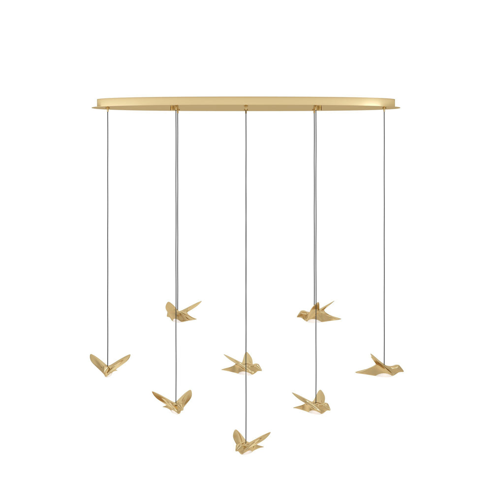 The PARATEBUENO 2 LED pendant range features a brass steel construction paired with a suspended birds design, elevating your space and giving it a sense of flight. The warm white LED lighting adds a cozy, inviting glow, perfect for any setting. Available in various sizes to complement your room perfectly.