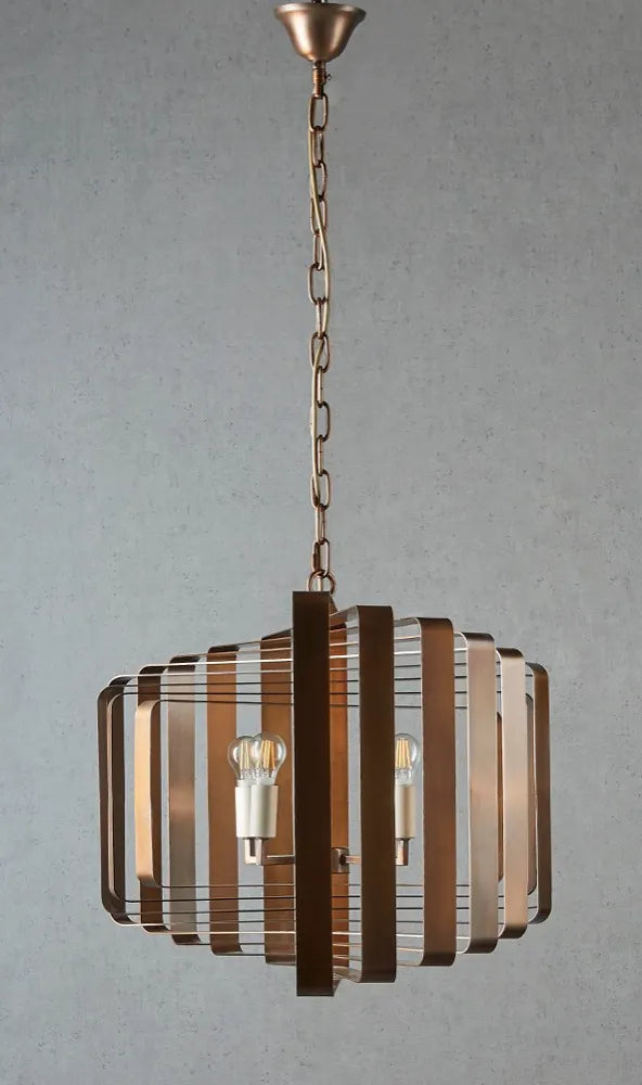 Our Bronte lamp is modern and elegant geometric iron hanging lamp, charm to its angular construction and striking silhouette. It is open rectangle shades horizontally in brass finish, with 4 candle style lights for nostalgic feel. Perfect to be installed on the high ceiling above staircase.
