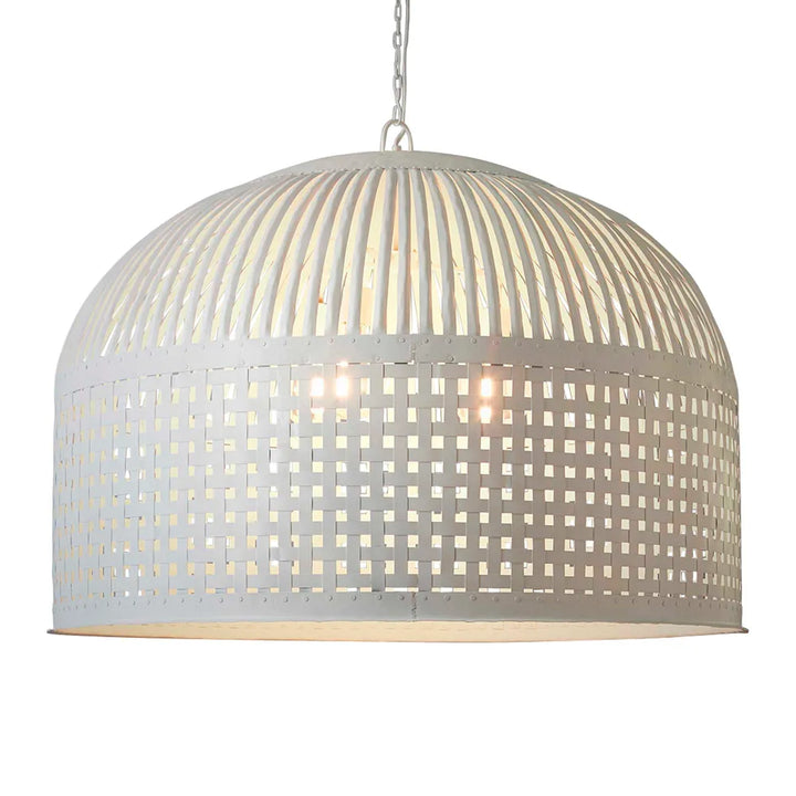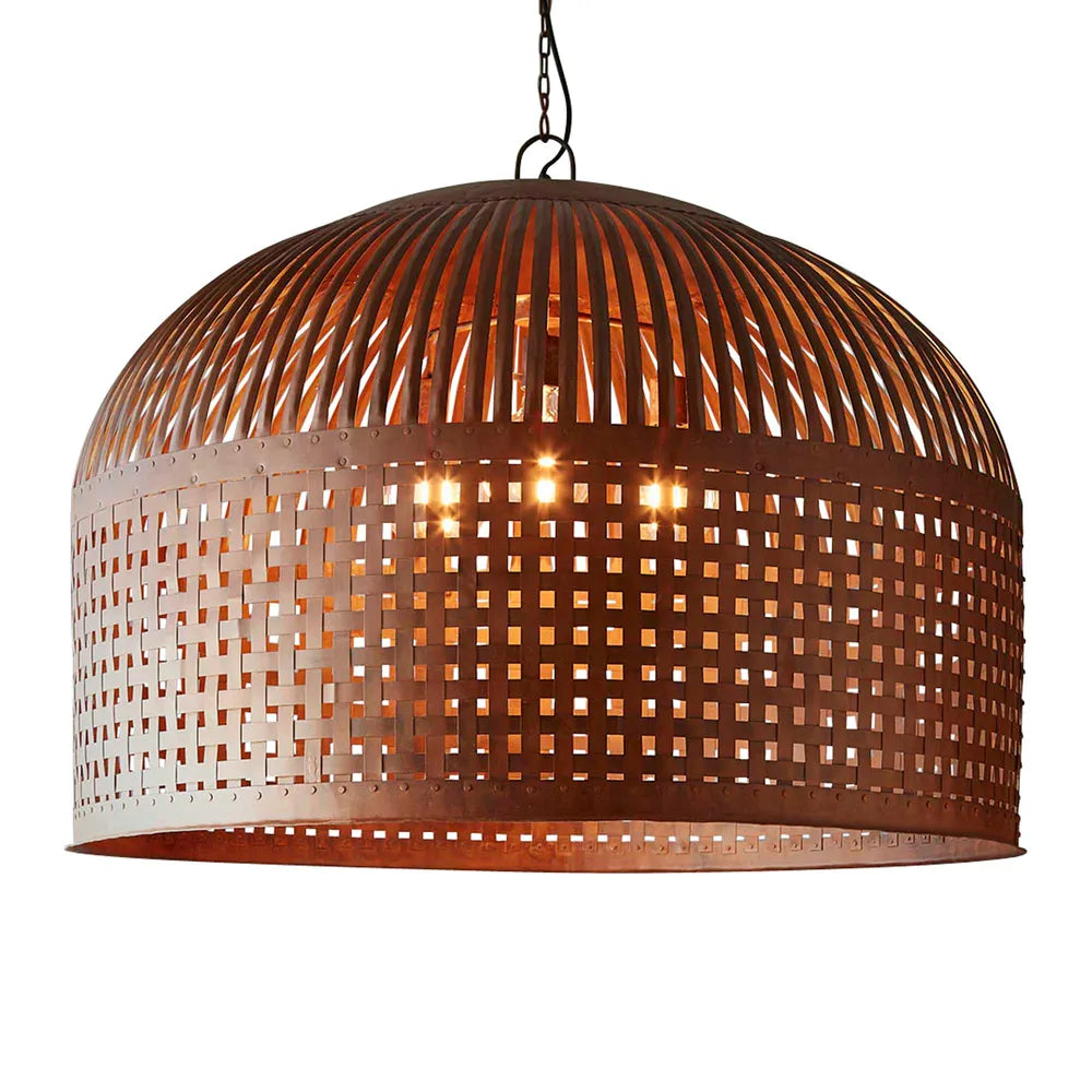 Esch features individual lengths of iron strips that are woven together and held in place by rivets, suspended beneath a graceful dome.