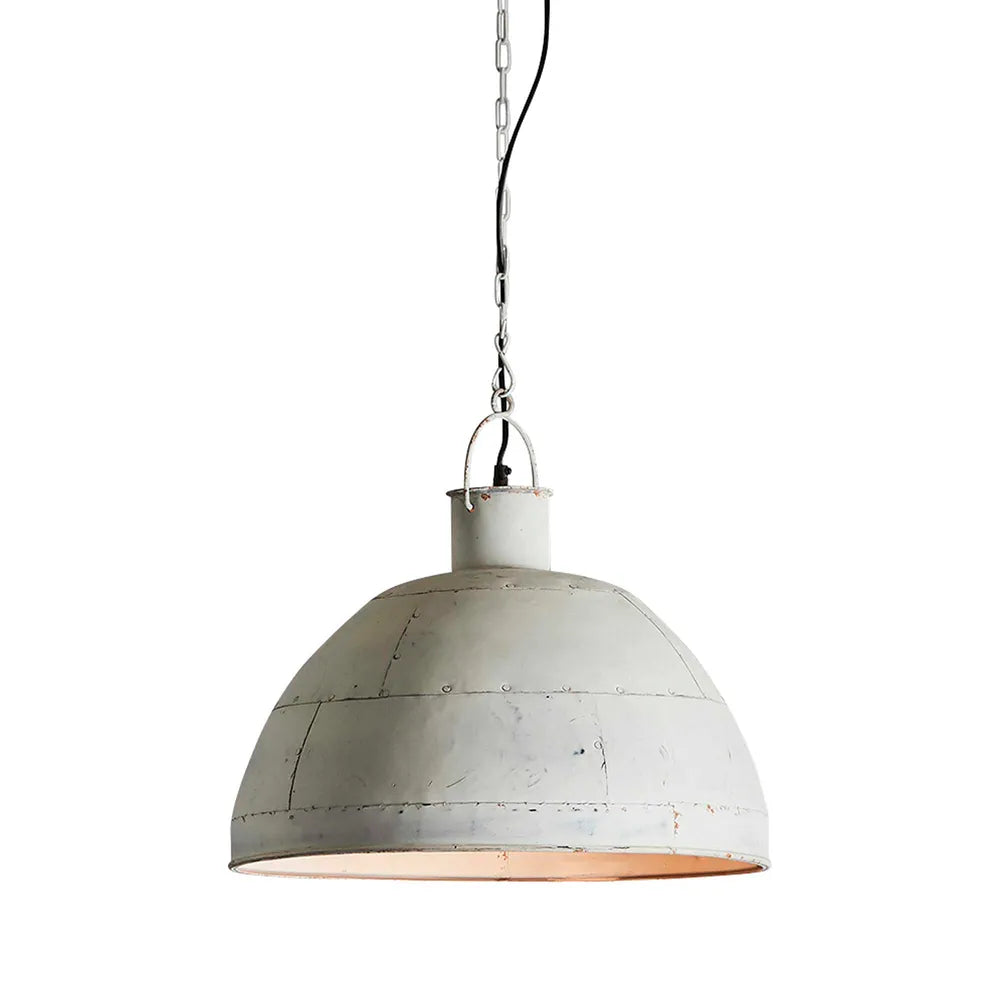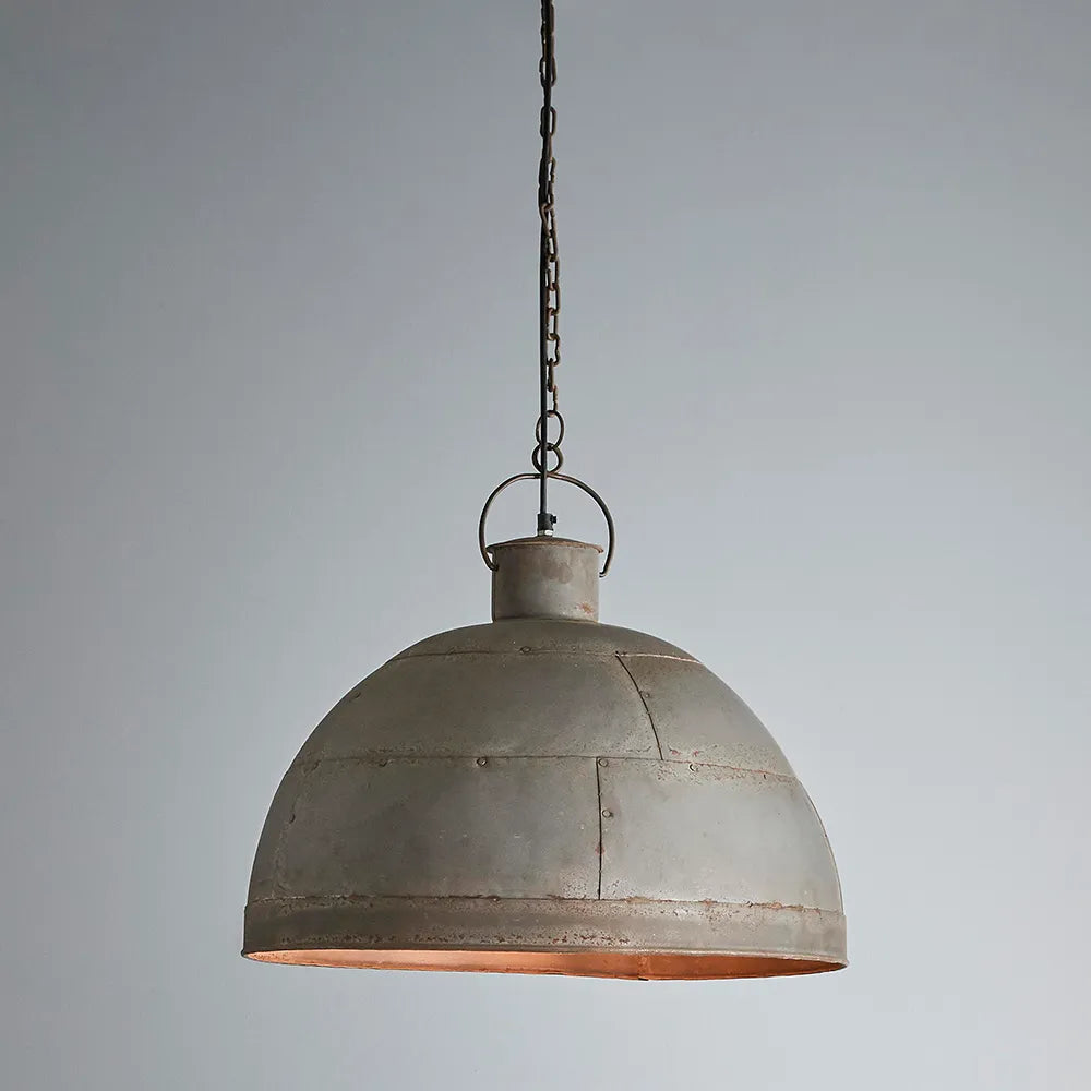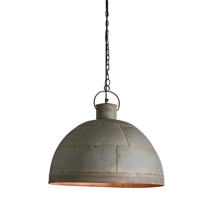 A riveted dome pendant in two rustic finishes. This pendant is designed to patina over time for a vintage aesthetic.