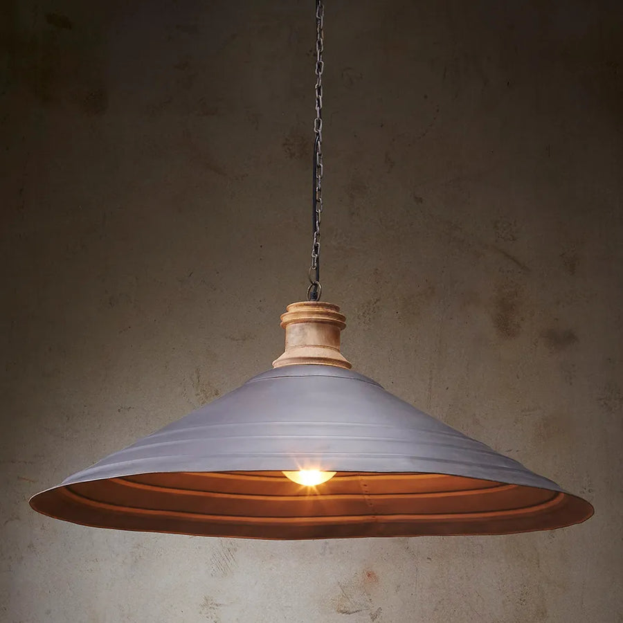A generously sized but lightweight zinc dish pendant with a ribbed design and turned timber top.