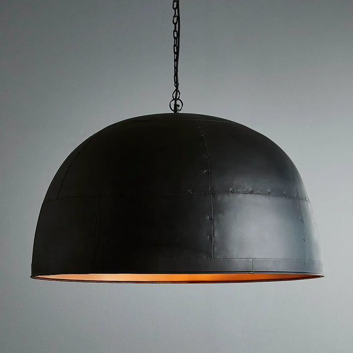 A mid-sized riveted dome with a matte black exterior and a gold interior.