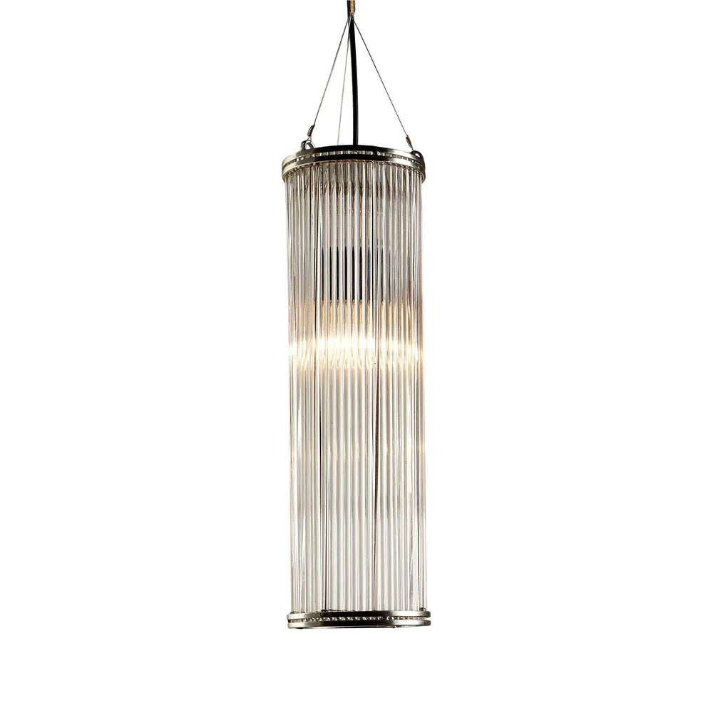 Our Verre pendant light is modern accent pendant that made from clear glass tubes with polished nickel frame metal top and bottom. The suspension cord is adjustable with metal string to ensure this pendant is hung levelled. The glass tubes diffuse light beautifully and produce amazing round reflection on the on the glasses. This pendant will instantly upgrade your foyer, kitchen island or living space.