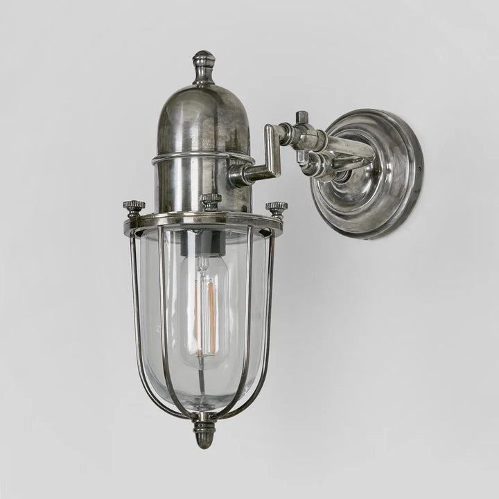 Our Chapel wall light is IP-rated 54 swing arm wall-sconce with clear glass and metal frame to suit for indoor and outdoor use. This lantern style wall lamp is used mainly for outdoor garden lamp, patios and entryways. With sleek appearance, it can also be used in bathroom as side mirror lights to match any industrial, rustic or loft-style décor.