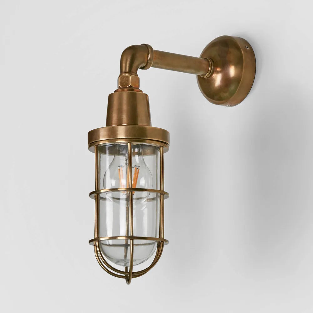 Our Starboard wall light is IP-rated 54 wall-sconce with clear glass and brass metal cage, which suitable for indoor and outdoor use. This lantern style wall lamp is used mainly for outdoor garden lamp, patios and entryways. With sleek appearance, it can also be used in bathroom as side mirror lights to match any industrial, rustic or loft-style décor.