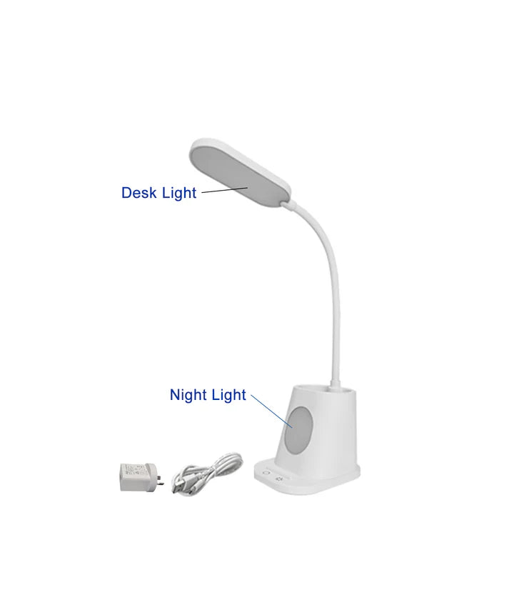 Description: Table Lamp w/Nightlight LED 2.8W 5000K 160Lm Table +3000K 30/14/4Lm Nightlight Wh Rechargeable IP20 H 500mm x W 100mm w/flexible neck & Pen Holder DC 5V Charging WTY 1YR