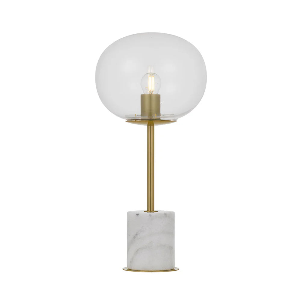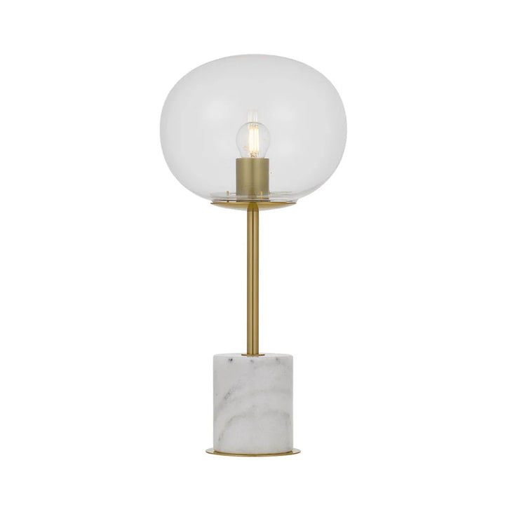 Inspired by 1920s design, the Dimas table lamp is retro elegance. The main feature is a strikingly simple cylinder of white marble that supports a metal tube. A mouth blown clear glass ovoid tops out the base which will encapsulate your chosen decorative light source. The metalware is finished in antique gold, which accents this impressive on trend lamp.