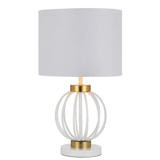 This GRADA lamp mixes a cage-inspired round body fashioned of black finish metal with a high polished antique gold accents. A round, fabric hardback drum shade complete with inner gold truly delivers a luxe style. Available in black or white.