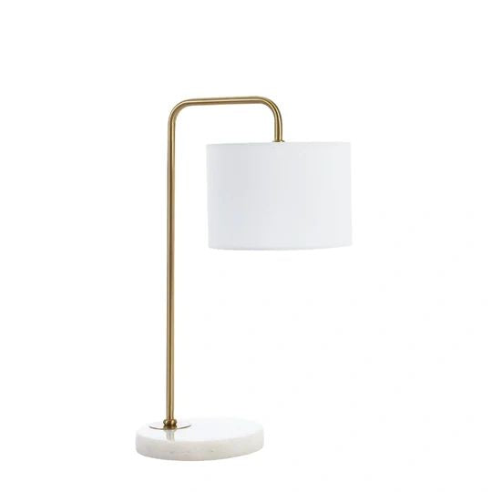 The Ingrid table lamp will enhance the appeal of your modern home with its simple and sleek design. The thick round marble base holds a tall thin curved body that suspends a fabric drum shade. Also available as a floor lamp.