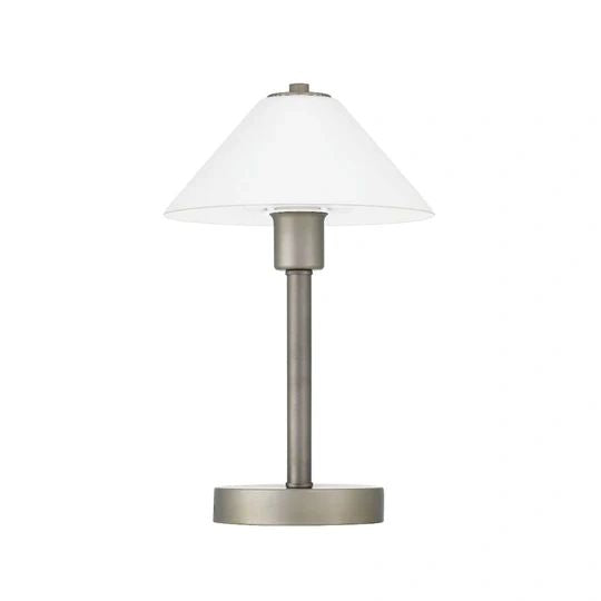 The Ohio contemporary design table lamp features a coolie shaped white glass shade, fixed to a slender brushed metal base. Touch anywhere on the metal base to turn on or off. Available in either antique brass, black or nickel base.