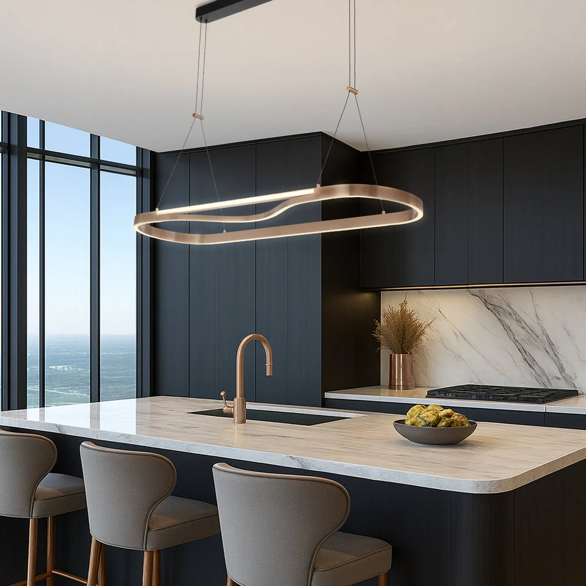 The Ostrom pendant range boasts a captivating coffee gold hue, enhancing any space with its elegant allure. Featuring integrated LED technology, it combines style with energy efficiency. Available in various sizes, these pendants offer versatility to suit diverse design preferences and room dimensions, making them an ideal choice for illuminating and accentuating any interior.