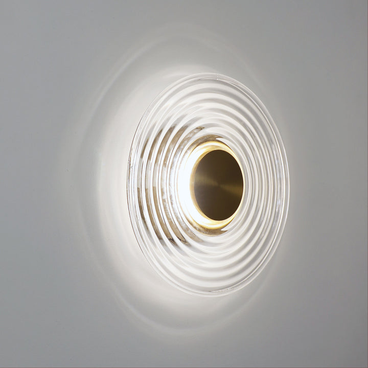 The CINCIN tri-colour LED wall light with satin brass metalware. Inspired by the ripple effect of a water droplet this fitting features a beautiful backlit clear glass disk which casts a soft shadow around the wall. Looks great as a feature above open shelves in a kitchen or as a hallway feature light. This fitting features colour temperature switching technology, meaning, the installing electrician can select the preferred colour temperature at time of installation.