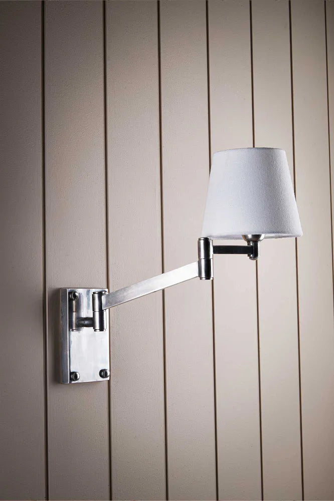 Our Oscar is Hampton industrial swing-arm wall light in antique brass or silver to create attractive and functional way to add light to bedside or favorite seating area. With rectangular backplate and swing arm, these will result rich warm and authentic aged look and feel which cannot be replicated. Recommended fabric lamp shade is with diameter 10 inch on bottom, and recommended lamp bulb is candle shape type of globe.