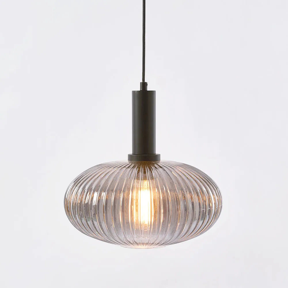 Rio Ceiling Pendant Smoky Grey crafted from Glass, Metal, offering a natural, warm ambiance. This piece is ideal for cozy dining spaces or living rooms.