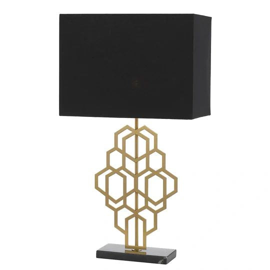 A sophisticated addition to a transitional space, the Akron table lamp is perfect for everyday living. A rectangular shade with gold lining sits atop a laser-cut deco base. The marble base is a luxurious touch that brings added beauty. Offered in antique gold contrasted in black or white and available in 2 sizes.
