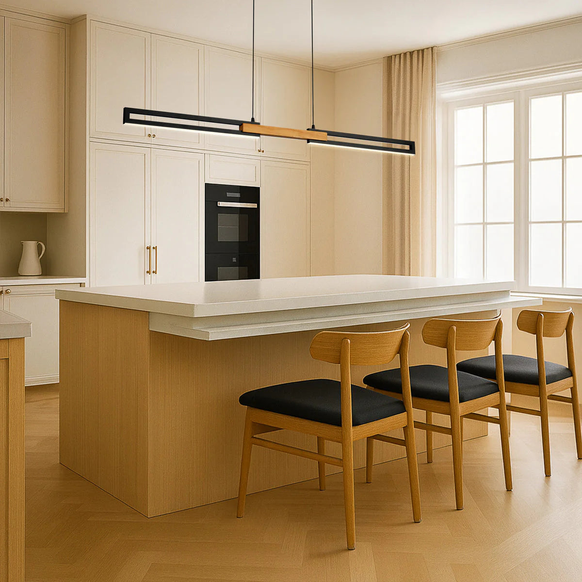 The Thorin linear pendant is an elegant lighting solution available in two sizes—120cm and 180cm—and two colour options. Crafted from a combination of iron and wood with a sophisticated sand finish, this indoor pendant features integrated LED lighting with a 3CCT function, allowing you to adjust the colour temperature between 3000K, 4000K, and 5000K. Its sleek design makes it perfect for illuminating dining areas, kitchens, or any contemporary space.