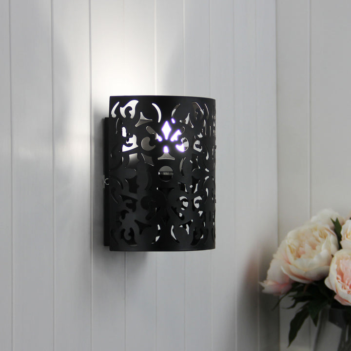 Wonderful when lit, the beautiful Vicky wall light sits flush against the wall. A painted metal shade featuring a cutout pattern, Vicky is also available in a matt white finish. Mix and match with the Vicky ceiling lights, in white or black.